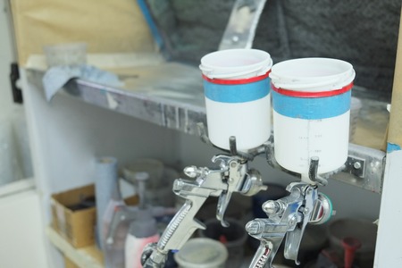 spray guns in the paint shop repair shop, close-up