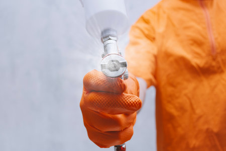 Close-up of painter hand in orange protective glove holding spray gun and applying paint. Car painting, industrial coating, body repair and maintenance concept