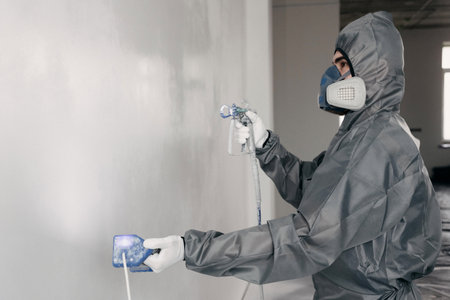 Low angle of professional male worker painting wall with spray gun. Adult in white protective costume and face mask. Copy space in right side. Renovation and construction site concept