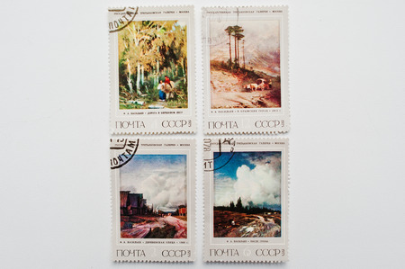 UZHGOROD, UKRAINE - CIRCA MAY, 2016: Postage stamps printed in USSR showing painting from State Tretyakov Gallery,Moscow, circa 1975