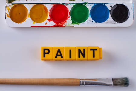 Paint brush and box with watercolors on white background. Art workplace for children. Top view with copy space flat lay.