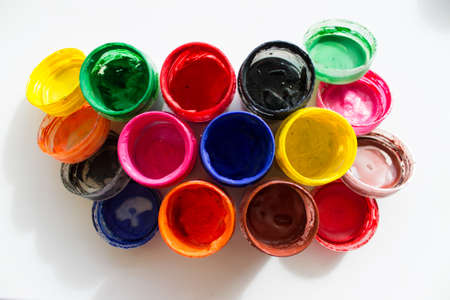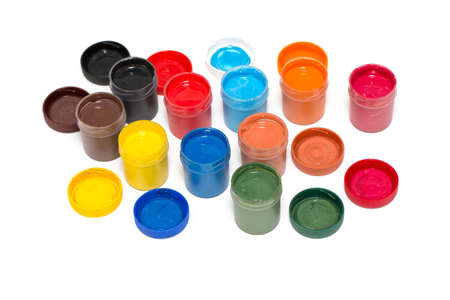 Jars with colored gouache paint on white background