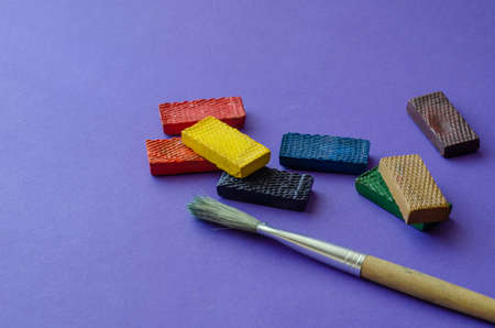 Set of dry watercolor paints and brush on a blue background. Paint brush and paint without box. Creativity, drawing. Close-up. Selective focus.
