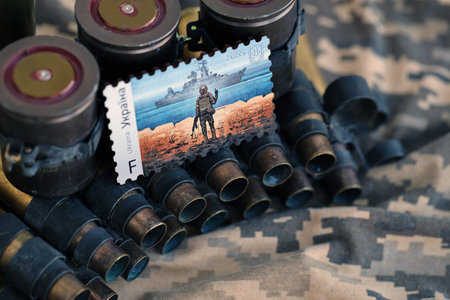 TERNOPIL, UKRAINE - SEPTEMBER 29, 2023 Famous Ukrainian postmark with russian warship and ukrainian soldier as wooden souvenir on army camouflage uniform cloth and machine gun belt shells