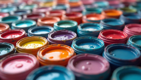 A colorful collection of paint pots in various shades creates a mesmerizing visual feast, inviting creativity and artistic expression. The glossy surfaces reflect light, showcasing hues of blue, orange, pink, and purple, perfect for inspiring artists and crafters alike.