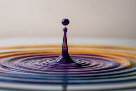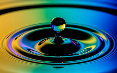 This stunning image captures a single water drop creating ripples on a vibrant surface, showcasing the beauty of fluid dynamics and color interplay.