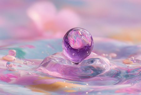 A macro shot captures a dynamic water droplet formation, reflecting a soft, colorful background
