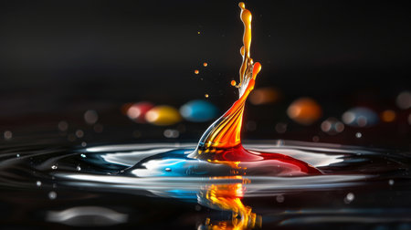 A vibrant macro photo capturing a water droplet creating a mesmerizing splash with colorful reflections