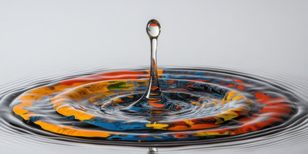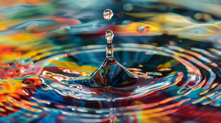 A water droplet is captured mid-fall, forming a column and creating ripples on a vibrant, colorful surface.
