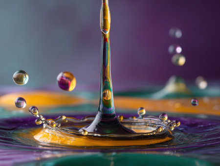 Liquid droplet captured mid-splash, surrounded by colorful swirling waves and bubbles, creating a mesmerizing abstract visual. Vivid hues of purple, orange, and green dominate