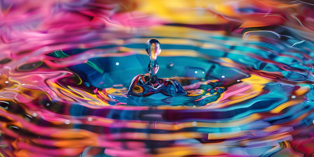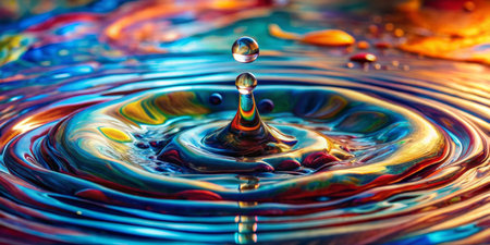 A single droplet falls gracefully into a pool of water, sending colorful ripples across the surface, reflecting the hues of a bright, sunny day, creating a mesmerizing display of color and motion.