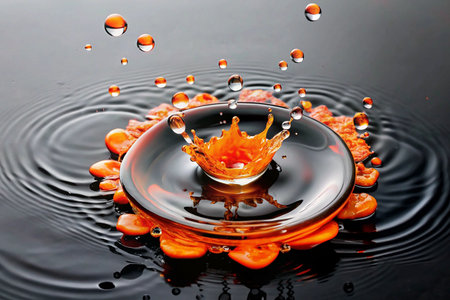 Orange Liquid Splashing in Water, Abstract Design, Dark Background, Ripples