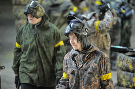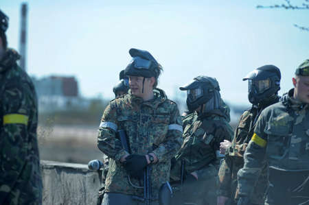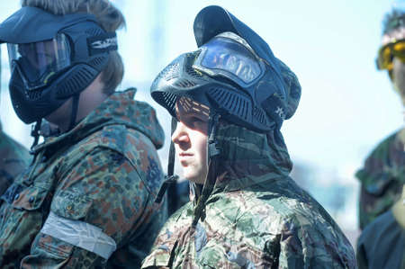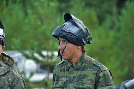 St. Petersburg, RUSSIA 20.06.2014 Open-air paintball tournament at the end of summer in nature, People in camouflage, with paintball guns and masks