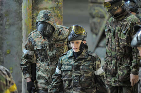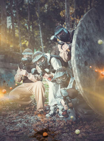 Warriors aimimg with paintball guns, team game