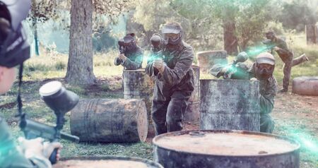 Portrait of team of adults playing on paintball battlefield outdoor, image with glowing and blur effects