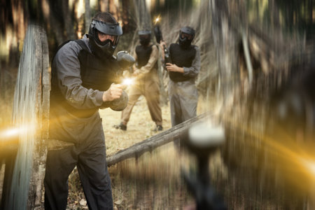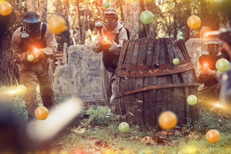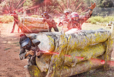 Team of adult people playing paintball on battlefield outdoor