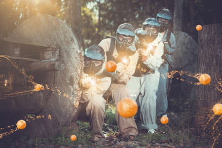 Group of paintball players in action on the battlefield in the forest