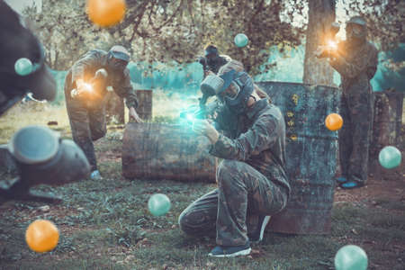 Paintball players in protective masks and masks on the battlefield.