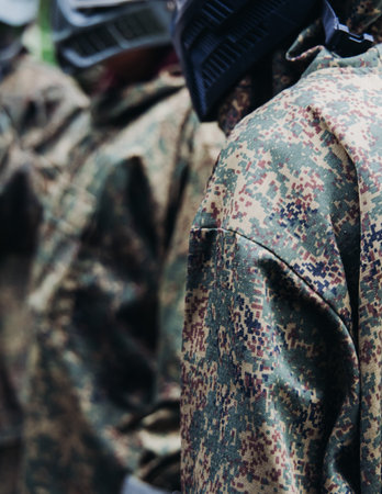 Paintball game, team in camouflage protective uniform with paintball guns and ammunition, strikeball arena battlefield, paintballer aiming and shooting at opponents, airsoft players match tournament