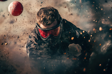 A paintball player in gear ducks and moves amid exploding paintballs, capturing dynamic action and excitement.