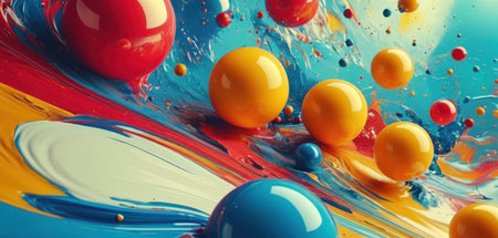 A stunning display of colorful paint splashing into water with balls creating vibrant waves. Perfect for creative projects and artistic backgrounds.