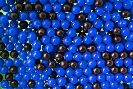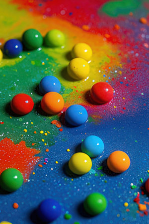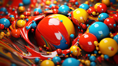 A bunch of red and blue balls are on a table in liquid paint, AI