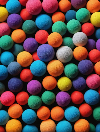 Foam balls in bright neon colors on a textured black surface, creating bold visual contrast