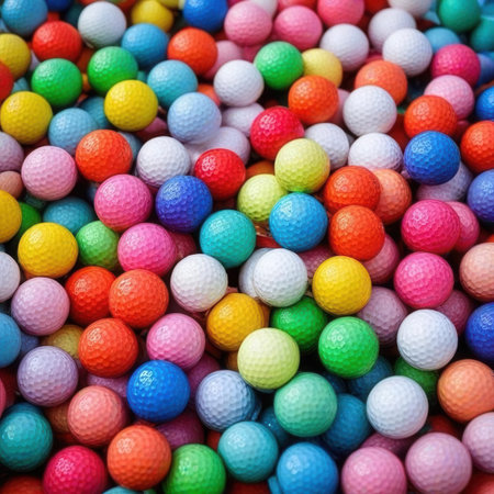 A top-down view of a pool of colorful plastic balls, arranged in a random, playful pattern.