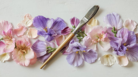 A captivating scene featuring a variety of flower petals and a paintbrush on a soft surface, perfect for art, creativity, and floral inspiration.