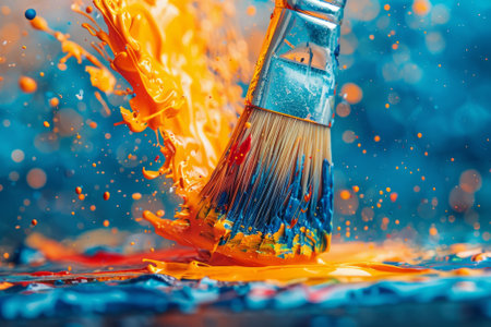 Paintbrush with Orange and Blue Paint Splashing on Canvas, Creating Abstract Art with Vibrant Colors