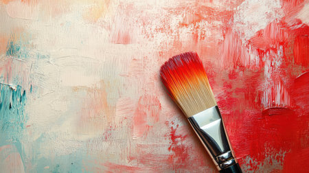 A colorful abstract background featuring a paintbrush resting on a vivid texture of pink, orange, yellow, and red shades, perfect for art-related themes.