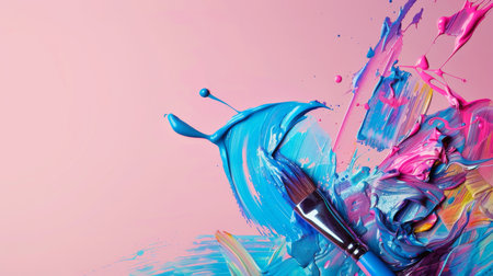 Paintbrush and palette with blue and pink paint, abstract background