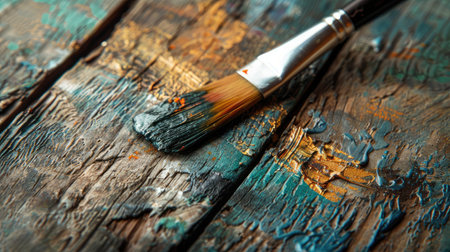 an artist's hand holding a paintbrush, delicately applying strokes onto a rustic wooden table