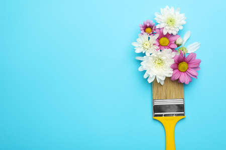 Brush painting with chrysanthemum flowers on light blue background, top view. Space for text. creative concept