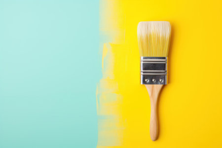 Paint brush on yellow and blue background with copy space, top view