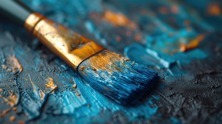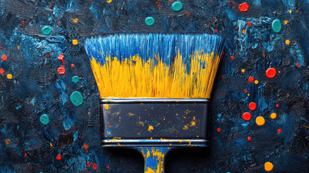 A paintbrush with blue bristles is painted in yellow, and small dots of red and green color on the brush's tip create an artistic background. The background is a dark navy blue, creating a contrast between the colors. This design could be used for creative graphic designs or art-themed projects --chaos 30 --ar 16:9 --stylize 500 --v 6.1 Job ID: 0d245d20-8dd0-4128-be7b-d30ca15c8ad6