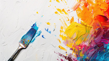 Close-up image of a paintbrush with vibrant splashes of paint, showcasing the dynamic interaction of liquid and color. The image exhibits a vivid explosion of color on a textured surface, emphasizing the artistic expression and creative process of painting.