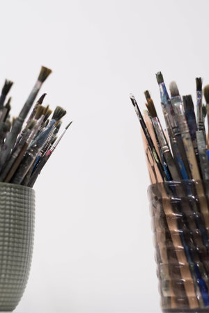 Artist's workplace. Different size and quality artistic brushes in ceramic jug.