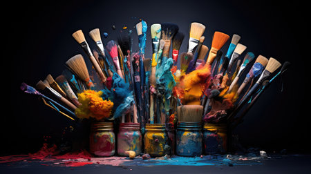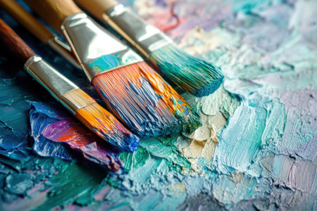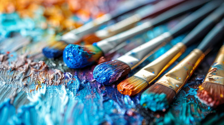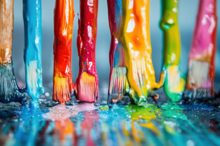 A closeup of vibrant paintbrushes dripping colorful paint onto a surface, showcasing the beauty of artistic expression and creativity through vivid hues and textures.