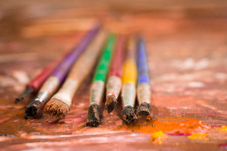 Drawing classes tools in art studio. Angle top above view photo of paintbrushes lying on palettewith oil paints brushstrokes mixture big tassels