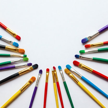 Various paintbrushes are arranged in a row showcasing vibrant colors on their bristles. Each brush displays a unique shade, revealing creativity and artistic expression.