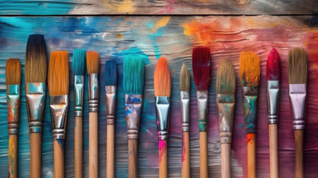 A colorful array of paintbrushes with vibrant paint residues, arranged against a rustic teal wooden backdrop, perfect for creative and artistic themes