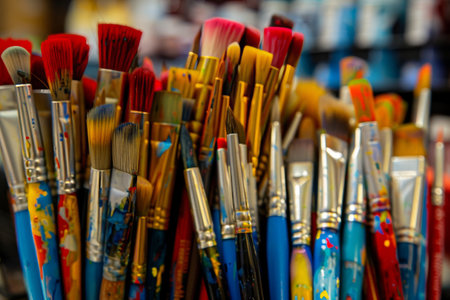 A close-up of various colorful and used paintbrushes showcasing an array of artistic tools