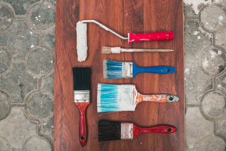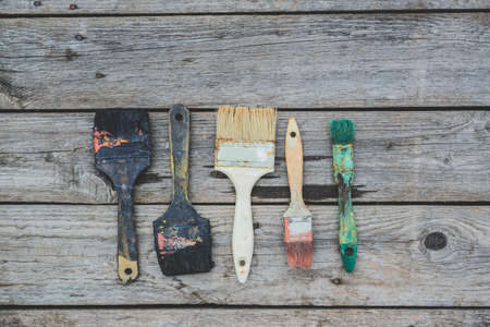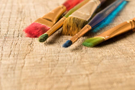 Different brushes on the old wooden table . Selective focus. Creative concept.