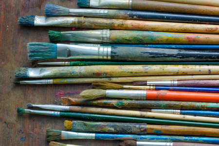 Paint brushes closeup on gray background, set of artist supplies, dirty brush, art tools