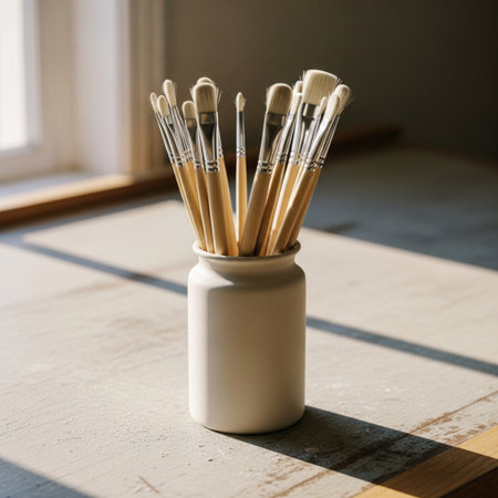 Colorful paintbrushes glass jar blurred background vibrant art tools creative workspace artistic supplies paintbrush set studio equipment artistic