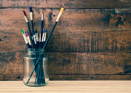 row of artist paintbrushes closeup on old wooden rustic table, retro stylized