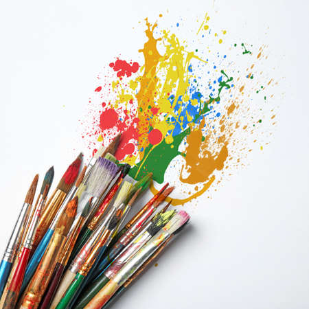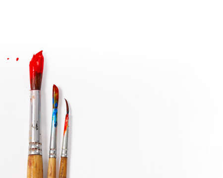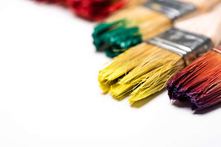 Artistic art supply utensils with paintbrushes isolated on white background with selective focus