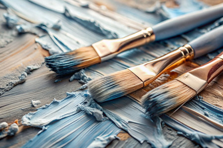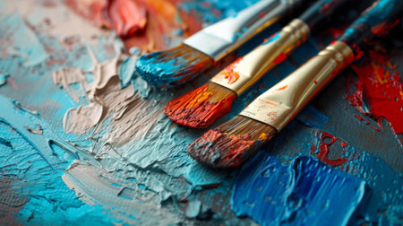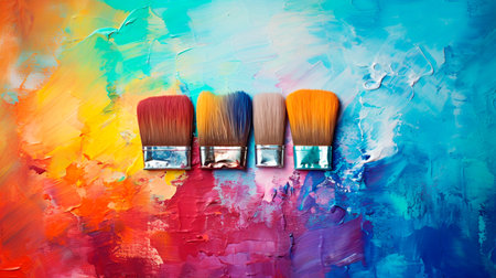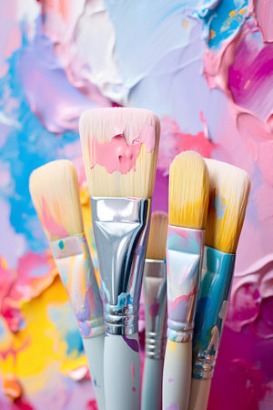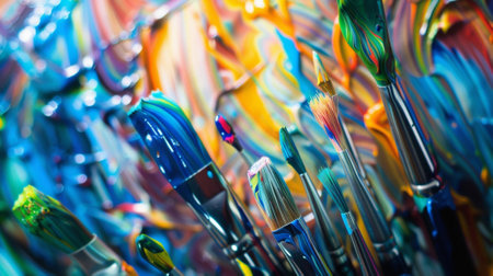 Paintbrushes aligned on a vibrant palette, closeup, soft lighting, colorful artistic backdrop