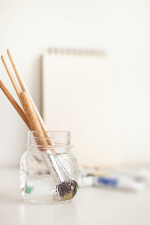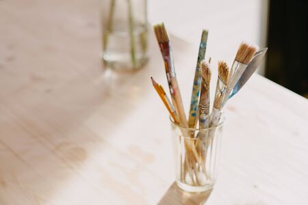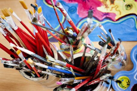 Paint brushes and watercolor paints on the table in a workshop, selective focus, close up.